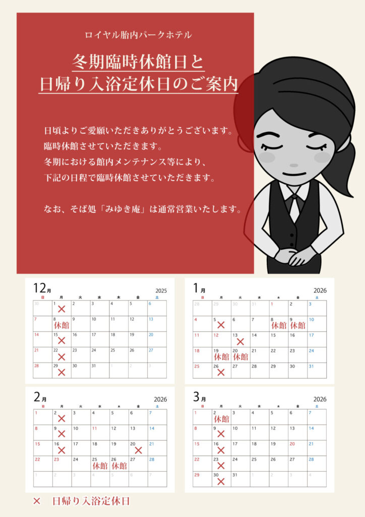 館内メンテナンス等に伴い、上記日程にて冬期の臨時休館日を設けさせていただきます。